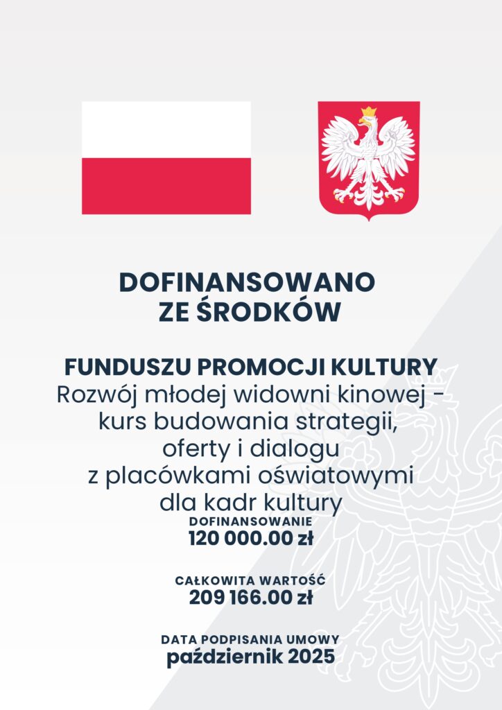 Minister Kultury i Dziedzictwa Narodowego, za pośrednictwem Funduszu Promocji Kultury, przyznał dofinansowanie projektowi Rozwój młodej widowni kinowej – kurs budowania strategii, oferty i dialogu z placówkami oświatowymi dla kadr kultury w ramach projektu Edukacja Młode Horyzonty, w ramach programu Edukacja kulturalna.